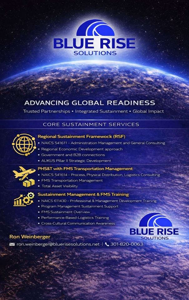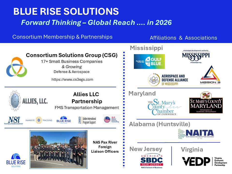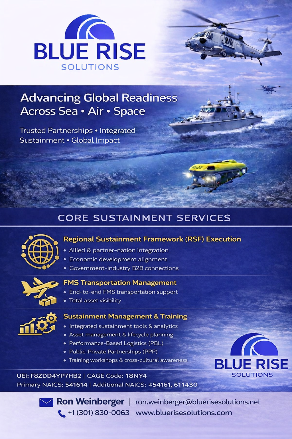 Blue Rise Solutions provides strategic consulting to help governments, businesses, and academia organizations succeed in global markets. We specialize in international logistics, Foreign Military Sales (FMS), and Building Partner Capacity (BPC) programs. We equip our clients to navigate complexity, strengthen operations, and achieve lasting impact.